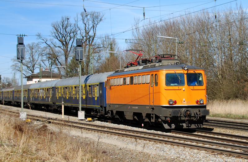 Fahrt der FCB - Fans (Basel) zum FCB (Bayern) mit der North Rail 1142 635-3 mit 16 Wagen der Eurostrand. Gleich erreicht er Uhingen auf ihrem Weg nach München. (13.03.2012)