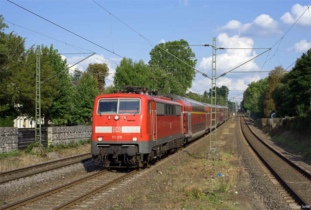 111 129-3 mit dem RE 10426 (Dortmund Hbf - Aachen Hbf) am 03.09.2017 in Erkrath.
