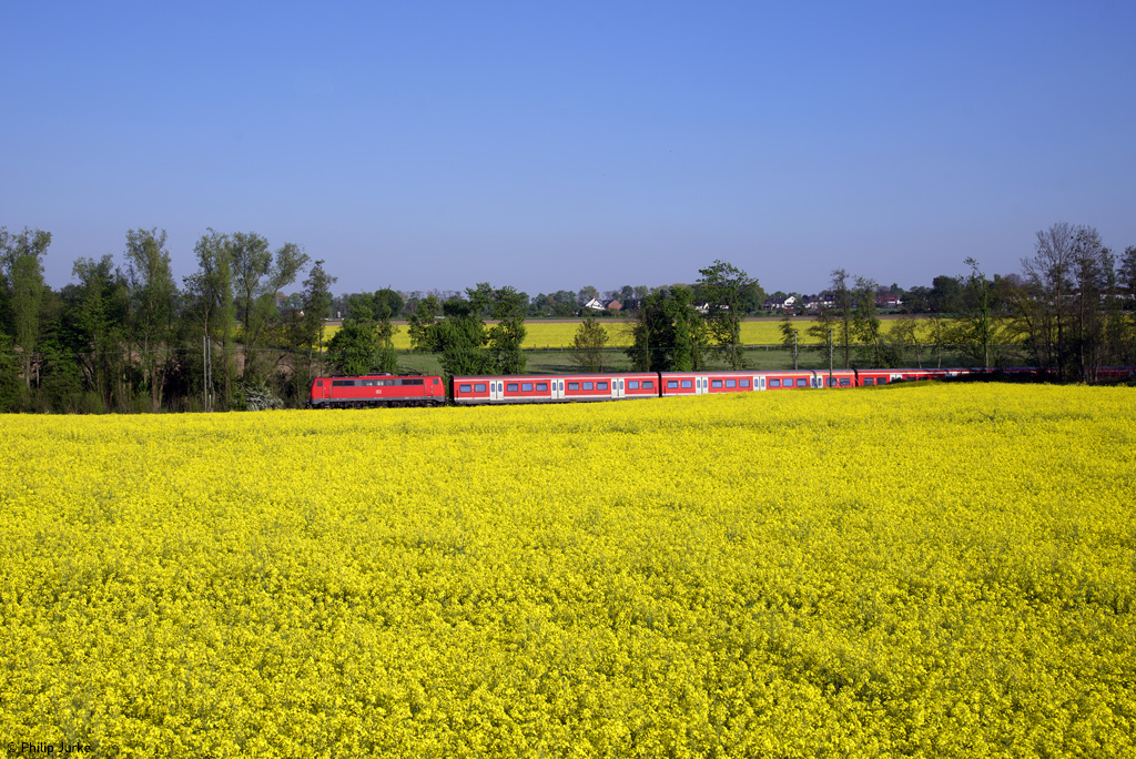 111 155-8 schiebt die S1 (Dortmund Hbf - Essen-Steele Ost) am 10.05.2017 zwischen Wattenscheid-Höntrop und Essen-Eiberg.