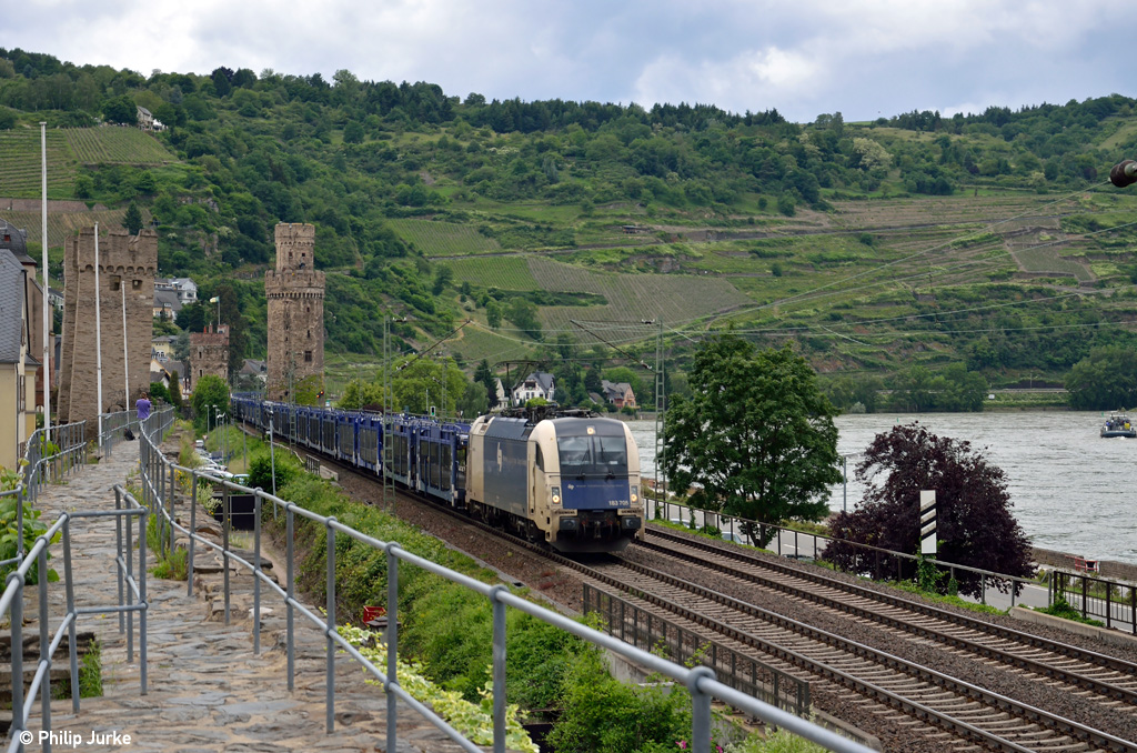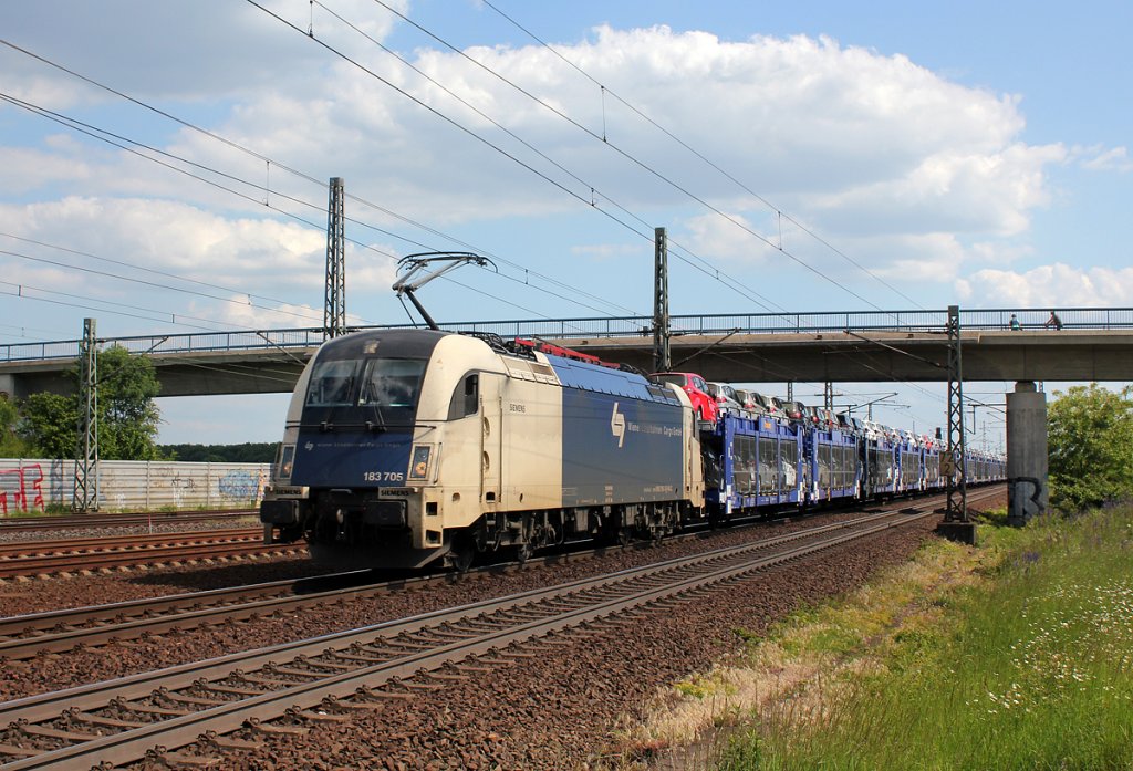 183 705-3 mit leeren Autotransportwagen am 15.06.2013 in Oberwesel.