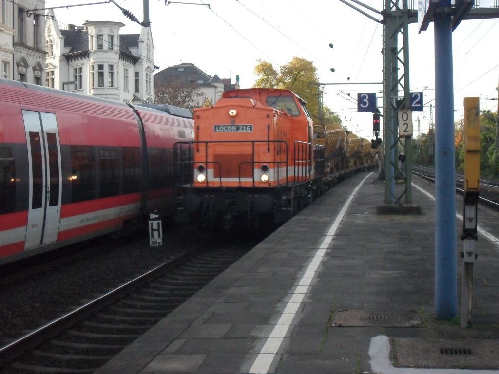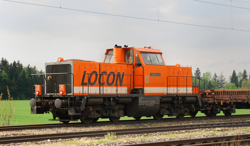214 003-6, Locon, aufgenommen vor einem kurzen Niederbordwagenzug, am 03.05.11, in Treuchtlingen.