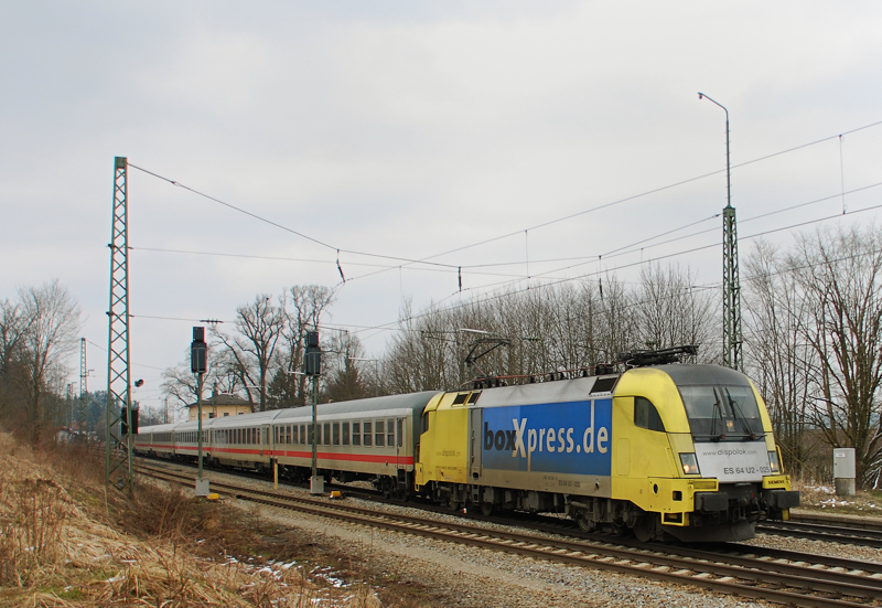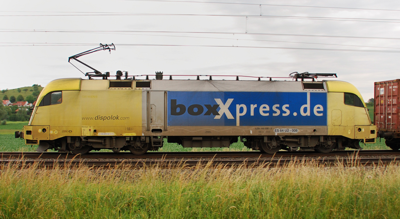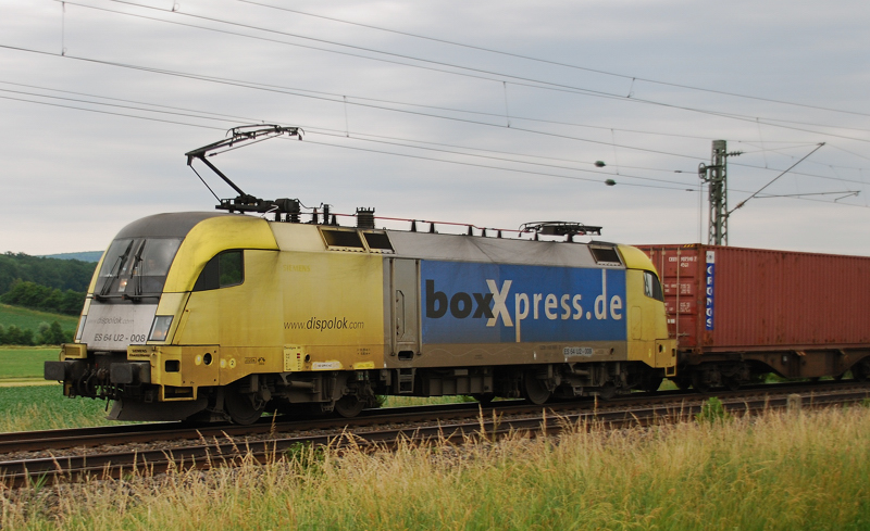 ES 64 U2-025, boxXpress, aufgenommen am 15.05.10, bei der Durchfahrt durch Treuchtlingen.