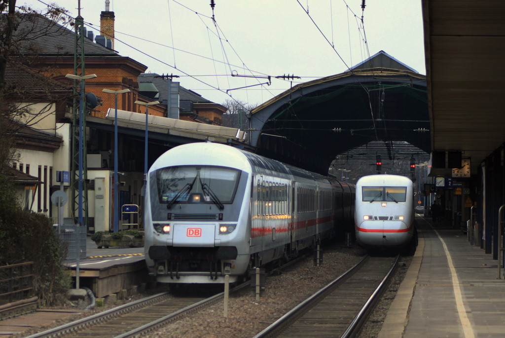 Ein IC Steuerwagen und ein ICE 402 treffen sich am 28.02.2011 im Bonner Hbf