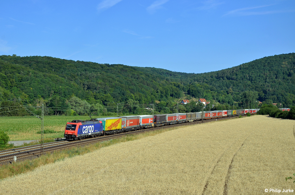 482 048-6 mit einem Güterzug am 16.07.2015 an der Staustufe Harrbach.