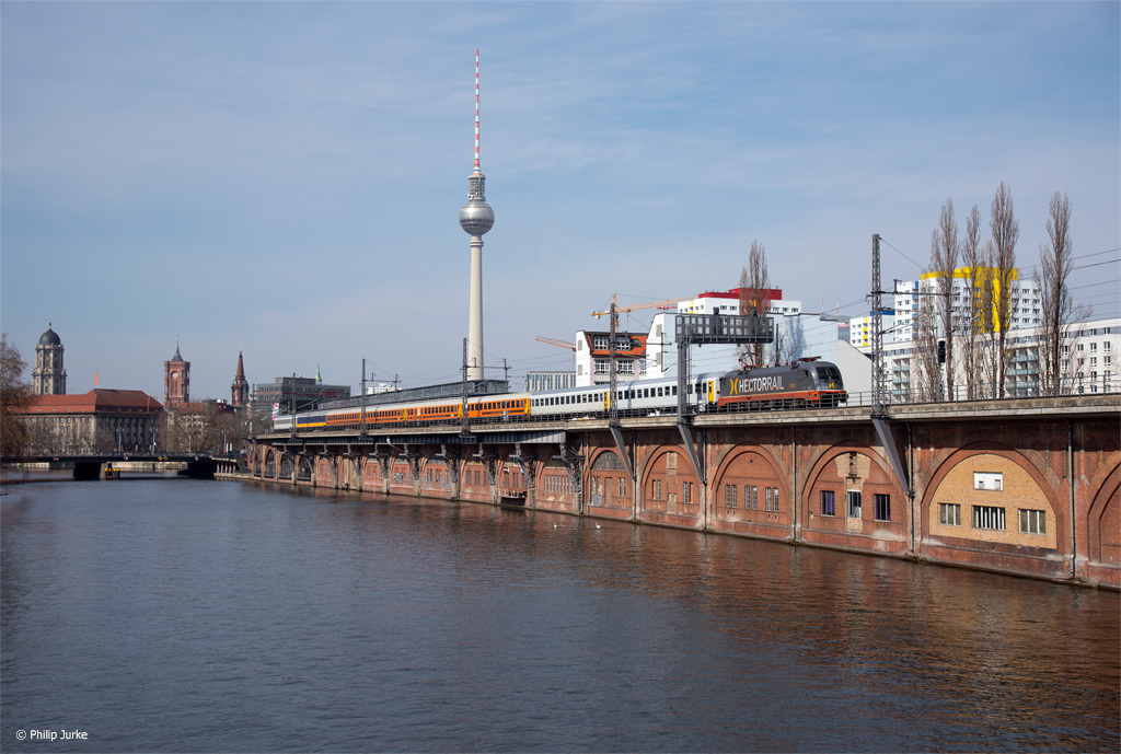 182 513-2 mit dem IRE 4272 (Berlin Ostbahnhof - Hamburg Hbf) am 30.03.2018 an der Jannowitzbrücke.