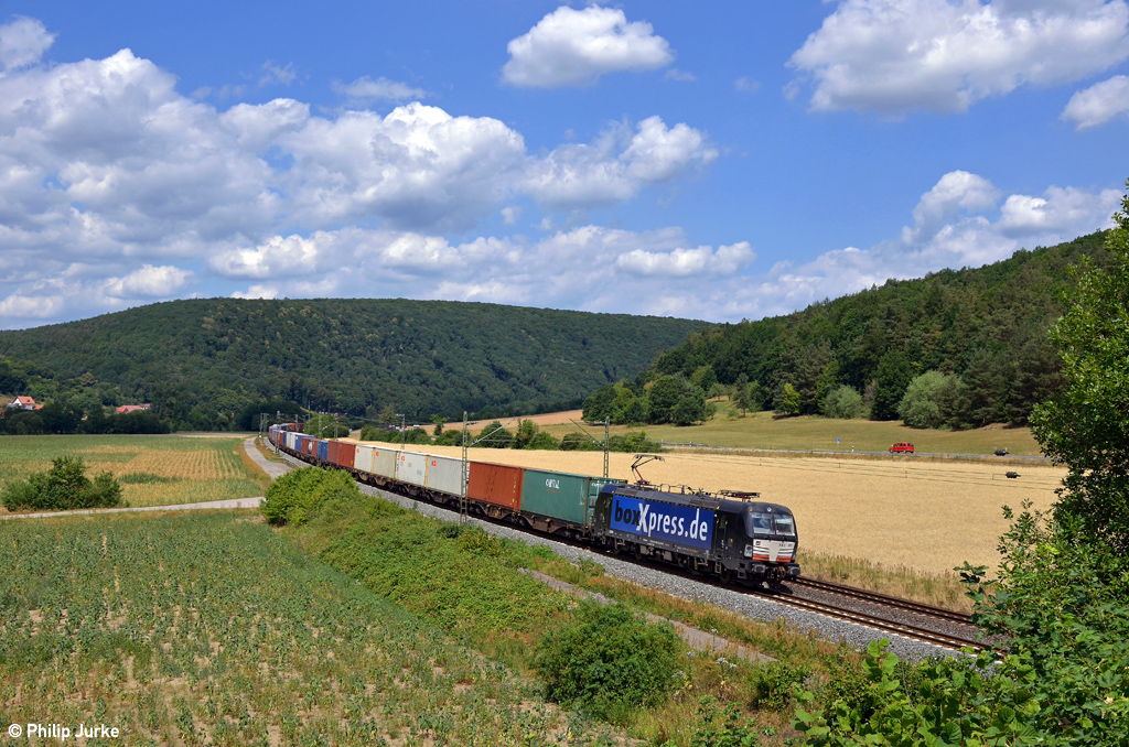 193 851-3 mit einem Güterzug am 16.07.2015 an der Staustufe Harrbach.