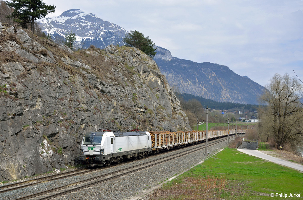 193 831-5 mit einem Holzzug am 11.04.2015 bei Jenbach.
