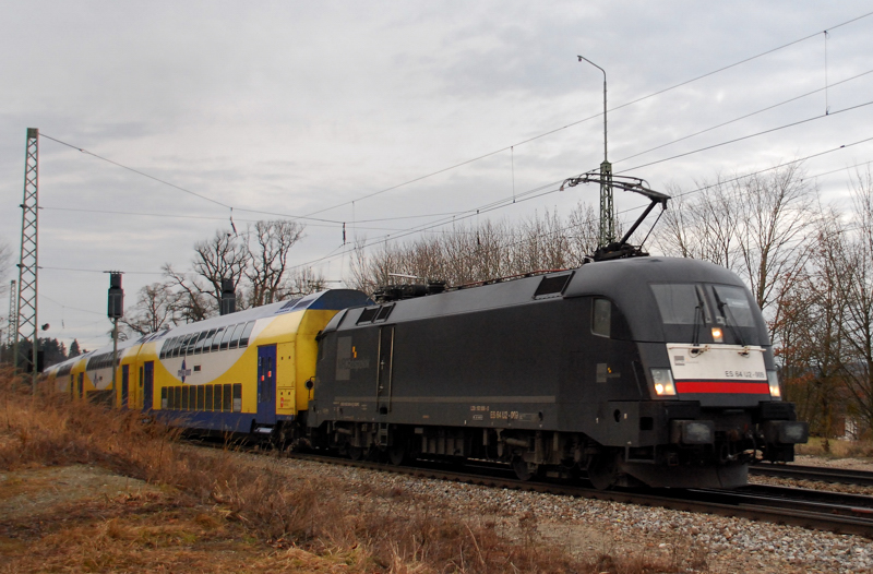 ES 64 U2-009, mit einer ausgewachsenen Metronom-Garnitur, aufgenommen bei der Ausfahrt aus Aßling, am 16.01.14.