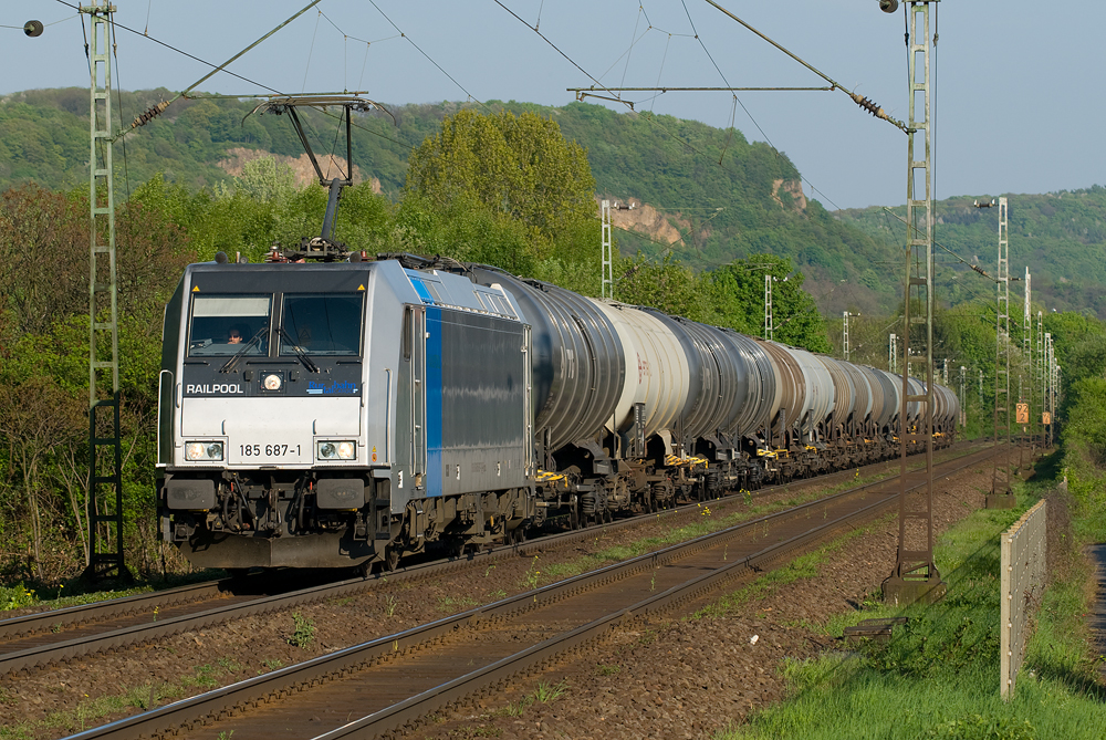 RAILPOOL 185 687-1 im Dienste von Rurtalbahn Cargo beim passieren von Kilometer 92 in Höhe Bonn-Limperich. (zum Bild)